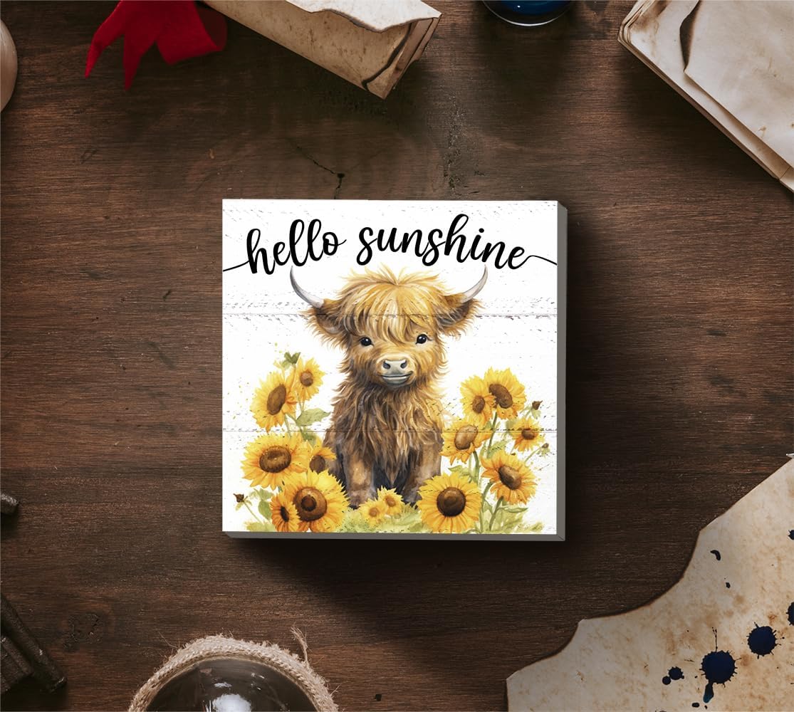 Highland Cow Decor, Sunflower Highland Cow Nursery Decor, Wood Box Signs Desk Decor, Hello Sunshine, Cow Decorations for Home, Cow Home Bedroom Decor, Cow Room Decor, Table Decor 5 x 5 Inch